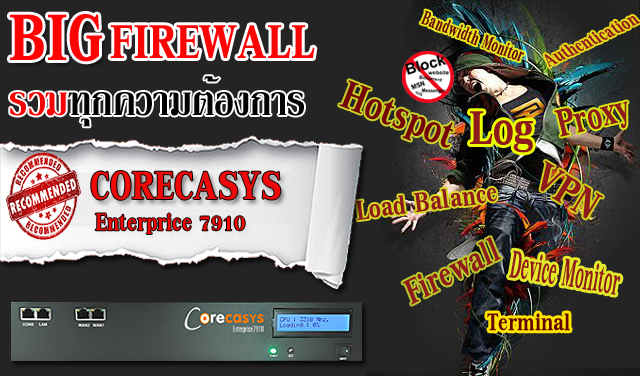 เลิกกังวลกับการมีอุปกรณ์หลายตัวภายในระบบ เวลาอยากจะพัฒนาอะไรก็ต้องซื้ออุปกรณ์ตัวโน้น ตัวนี้ เพิ่มเติม แล้วเมื่อถึงเวลาที่เครื่องลูกข่ายเพิ่มมากขึ้นก็ต้องเปลี่ยนอุปกรณ์ใหม่อีก Corecasys Firewall นั้น เริ่มต้นจากการตอบโจทย์ของระบบที่มีงบประมาณจำกัด ไม่ว่าจะเป็นโรงเรียน โรงพยาบาล ธุรกิจขนาดกลาง หรือธุรกิจขนาดเล็กที่กำลังเติบโต รวมถึงธุรกิจขนาดใหญ่ เช่นโรงแรม โรงงาน หรือธุรกิจที่มีสาขาหลายแห่ง ผลิตภัณฑ์ Corecasys Firewall 7910 กลั่นออกมาจากประสบการณ์ในการวางระบบนานกว่า 10 ปี .... ทุกฟังก์ชั่น คือฟังก์ชั่นที่ต้องใช้ จำเป็นต้องมี และใช้งานได้จริง จาก Reference ลูกค้าที่ใช้งานจริงนั้น เครื่องลูกข่ายประมาณ 700 เครื่อง เชื่อมต่ออินเตอร์เน็ต ADSL 4 เส้น ความเร็วรวมเพียง 24 Mbps สามารถให้บริการกับเครื่องลูกข่ายได้ถึง 500 เครื่องพร้อมๆ กัน โดยไม่มีปัญหาแต่อย่างใด
